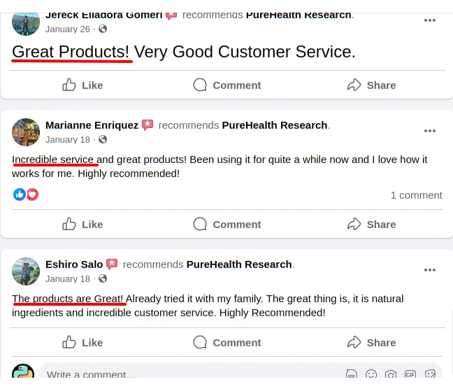 Customer Reviews: PureHealth Research, the parent company, has received a positive rating of 4.7/5 on Facebook from a substantial number of customers, indicating overall satisfaction with its services and products. While some negative reviews exist, the majority appear to be genuine.