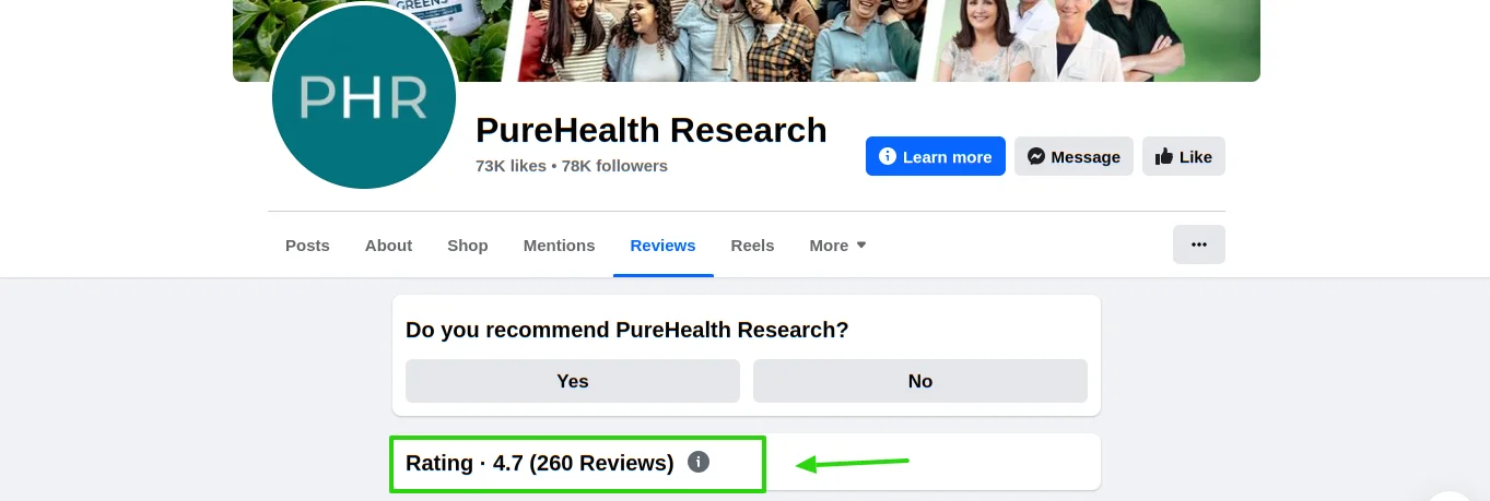 Store PureHealth Research has received a rating of 4.7/5 on Facebook from 260 customers.